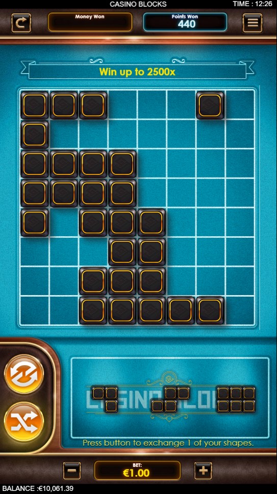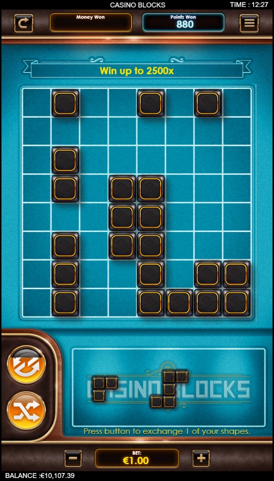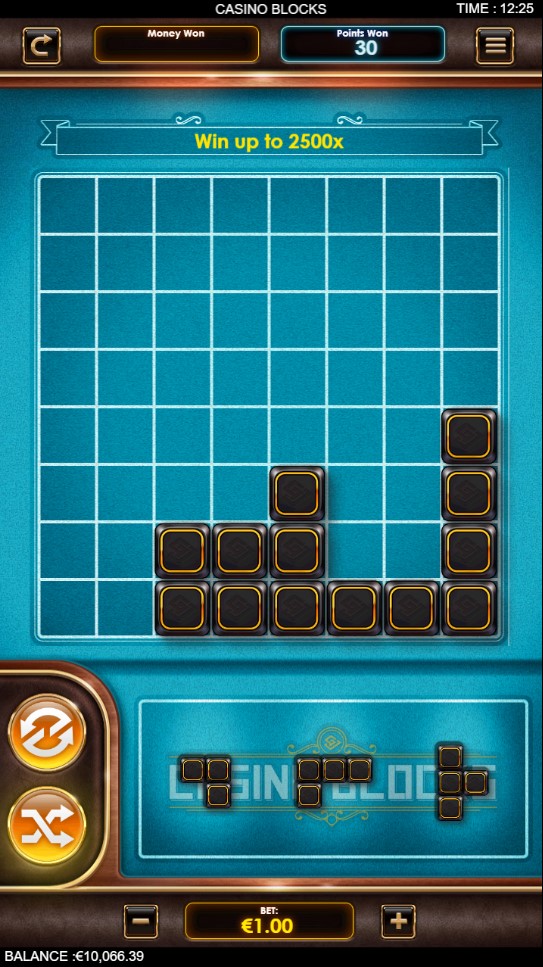 When experiencing Casino Blocks, players are given a random series of shapes which they must fit into an 8×8 grid. Every shape they place is a bet with the opportunity for large wins in the base game.