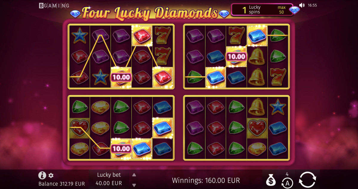 A 5×3 video slot, Four Lucky Diamonds includes 10-paylines – complimented by the titles Stacked Wilds – which can be replicated four times, as well as a lucky spins mode.