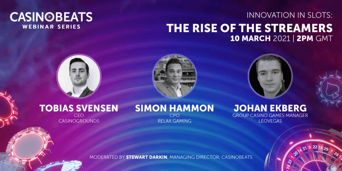 The CasinoBeats Innovation in Slots series continues on Wednesday 10 March with The Rise of the Streamers, featuring Tobias Svensen (CEO, CasinoGrounds), Johan Ekberg (group casino games manager, LeoVegas) and Simon Hammon (chief product officer, Relax Gaming).