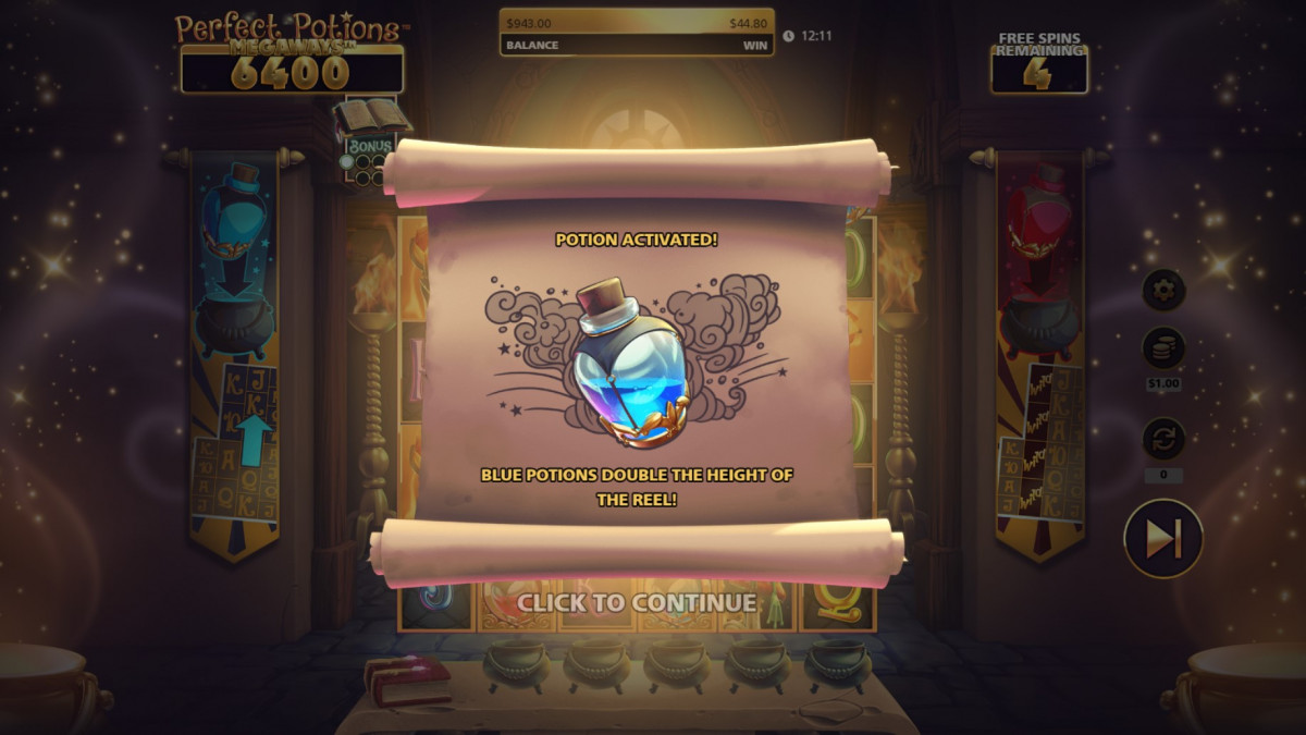 When a blue potion is triggered, the corresponding reel expands to double its original height and the new symbols then fill the reels. A red potion is then added above the reels and can cascade down.