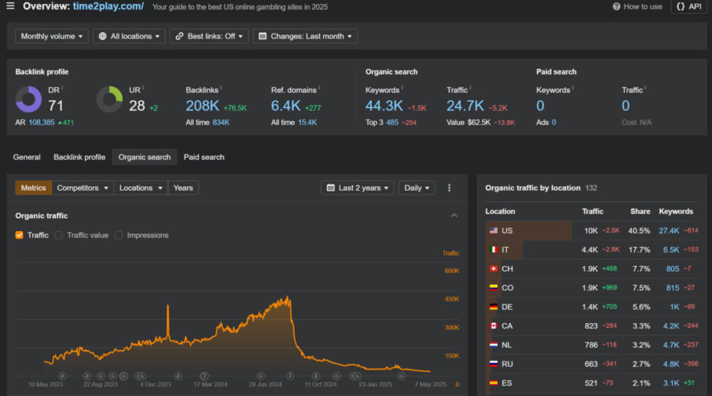 CasinoTopsOnline was Gentoo Media’s flagship brand and had 175,000 peak monthly visitors. The site now attracts under 5,000 a month and has seen a marked decline since Google’s Fall 2023 Core and Review updates, which largely penalized sites using tactics such as content scraping, auto-generated content, and cloaking to perform well in search.