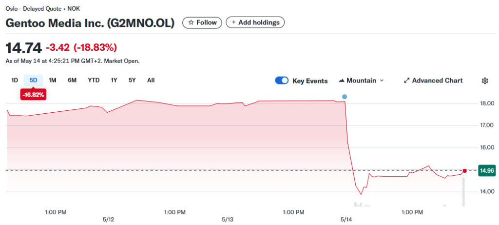 Gentoo Media’s share price has plummeted after the company announced €24.8 million in Q1 2025 revenue, down 11% from €28.0 million in the same quarter last year.