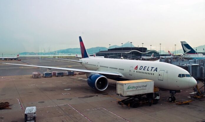 "Delta Airlines 777, Hong Kong, Sept. 2010" by In Memoriam: PhillipC is licensed under CC BY 2.0 .