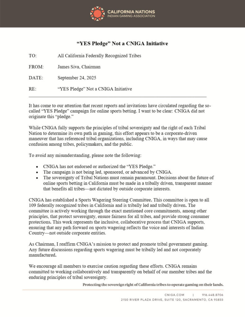 The letter, shown below, states, “While CNIGA fully supports the principles of tribal sovereignty and the right of each Tribal Nation to determine its own path in gaming, this effort appears to be a corporate-driven maneuver that has referenced tribal organizations, including CNIGA in ways that may cause confusion among tribes, policymakers, and the public.”