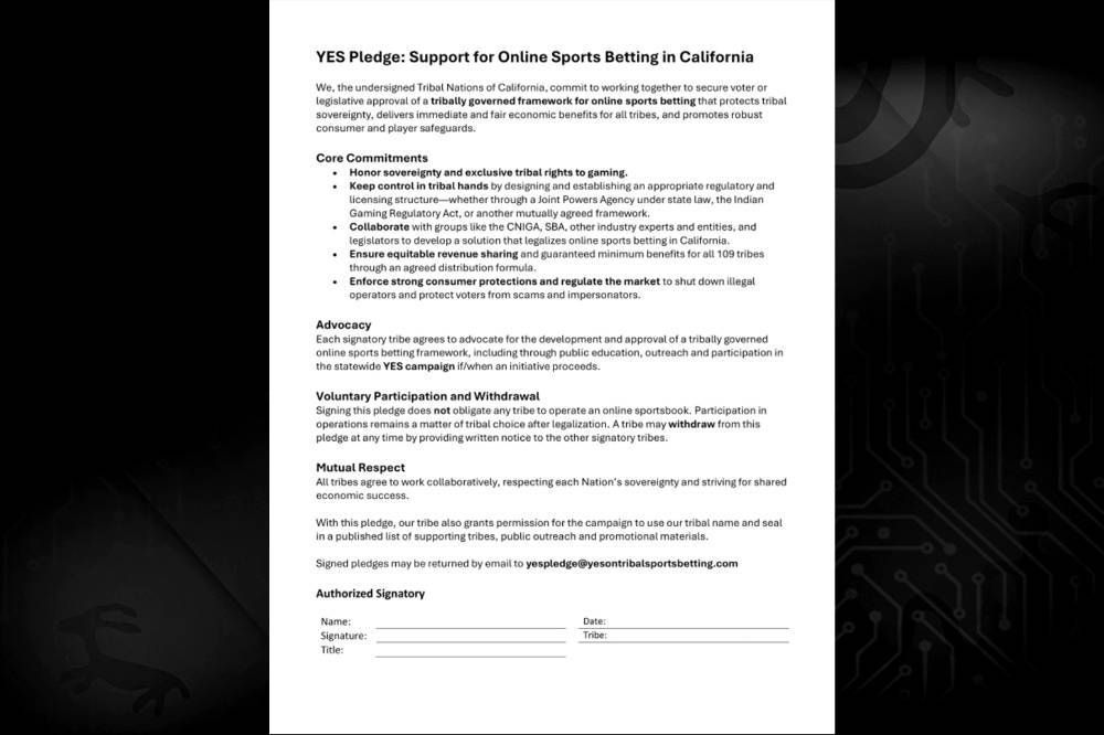 The document states, “We, the undersigned Tribal Nations of California, commit to working together to secure voter or legislative approval of a tribally governed framework for online sports betting”.