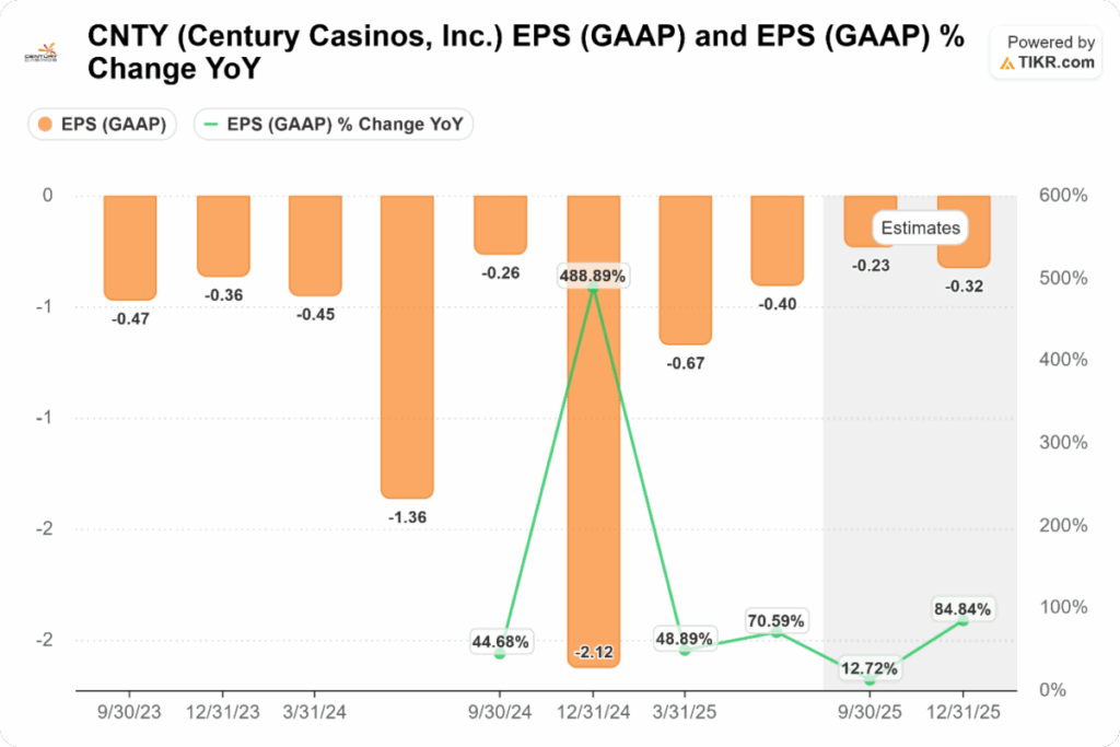 While there wasn’t any company-specific news last week, the decline appears to be in anticipation of the Q3 report, which is scheduled for this week. Analysts expect CNTY’s revenues to rise 2% in the quarter, while predicting a per-share loss of 20 cents.
