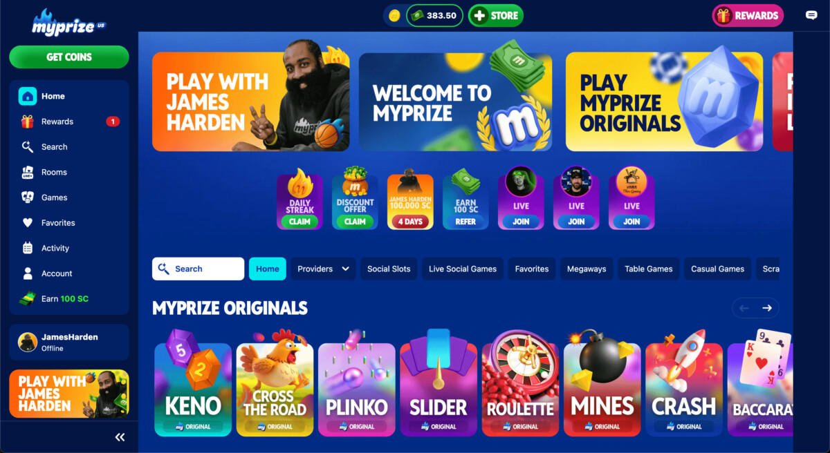 MyPrize describes itself as “the world’s fastest-growing multiplayer social gaming platform” in the press release announcing its “social gaming partnership” with Harden. The platform offers sweepstakes games and real-time multiplayer rooms, using a dual-currency model. Because players use virtual coins instead of making direct cash bets, MyPrize falls under the sweepstakes or social casino umbrella. And since it doesn’t allow real-money wagering, it isn’t classified as a traditional online casino or sportsbook.