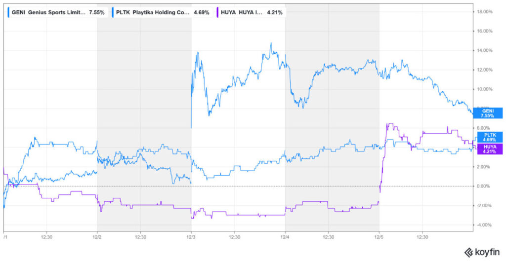 With gains of over 7.5%, Genius Sports was the best-performing gaming stock in our coverage. On December 3, Genius Sports held its Investor Day, where it presented an ambitious financial outlook for 2028. The company expects to generate an adjusted EBITDA of $365 million in 2028 on revenues of $1.2 billion. It also forecast free cash flows of $220 million, representing a healthy 60% conversion margin.