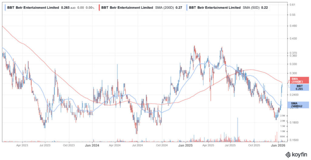 Betr Entertainment stock crashed last year but is up over 32% this year amid bottom-fishing. Notably, in December, the company had announced the sudden exit of its CFO, Darren Holley. Blake Matthews, who previously served as the Group Financial Controller, has assumed the role this year. While the stock fell after the surprise announcement, it has since recovered and has looked strong this year.