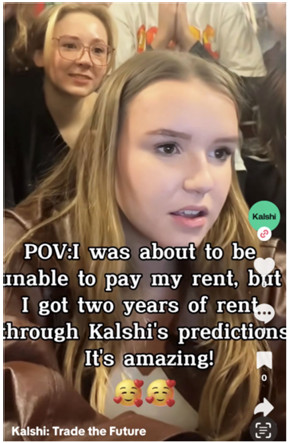 The lawsuit highlighted Kalshi’s social media ads that also targeted individuals looking to make a “quick buck.” One TikTok ad shows a college-age girl behind the text, “POV: I was about to be unable to pay my rent, but I got two years of rent through Kalshi’s predictions. It’s amazing!”