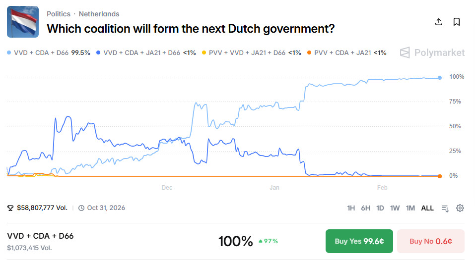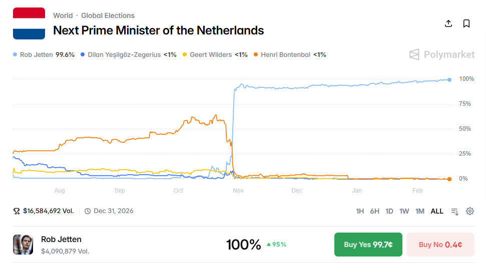 The next Prime Minister market saw over $16 million traded, with over $4 million of that on Rob Jetten, who will be formally installed next week.