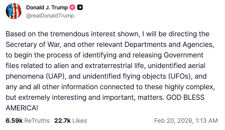 The spike came after Trump posted on Truth Social that he will direct US agencies, including the Defense Department, to “begin the process of identifying and releasing” government files on aliens and extraterrestrial life.