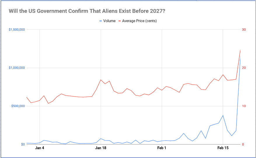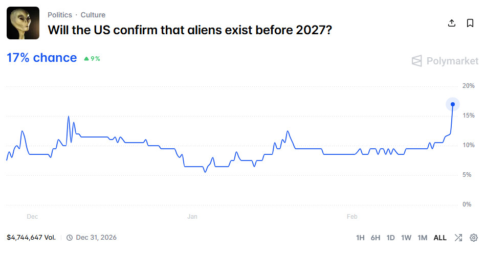 A related market at Polymarket has similar trading volumes. The market currently gives a 17% chance that the US will reveal aliens exist by the end of the year, up from 9% last week.