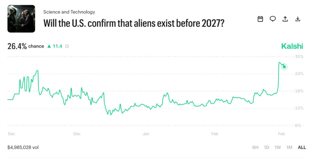 Ten days ago, CasinoBeats highlighted unusually large trades on the market: “Will the U.S. confirm that aliens exist before 2027?” at Kalshi.