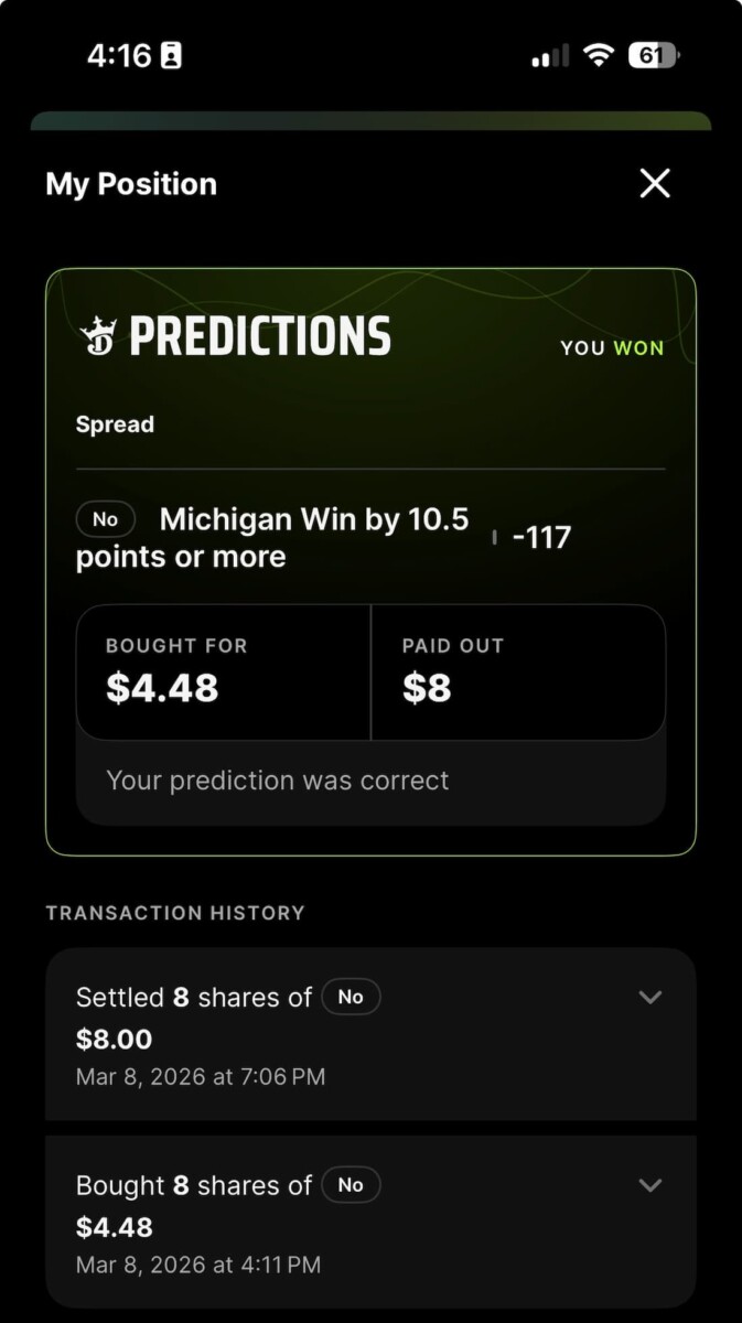 Final score: Michigan 90, Michigan State 80. Grabbing the 10.5 at Predictions made me look like a genius, but I failed to execute the most important part of the plan. After previously opting in for the $50 bonus, or so I thought, the move was to make the same exact bet on Michigan State +10.5 for $50.
