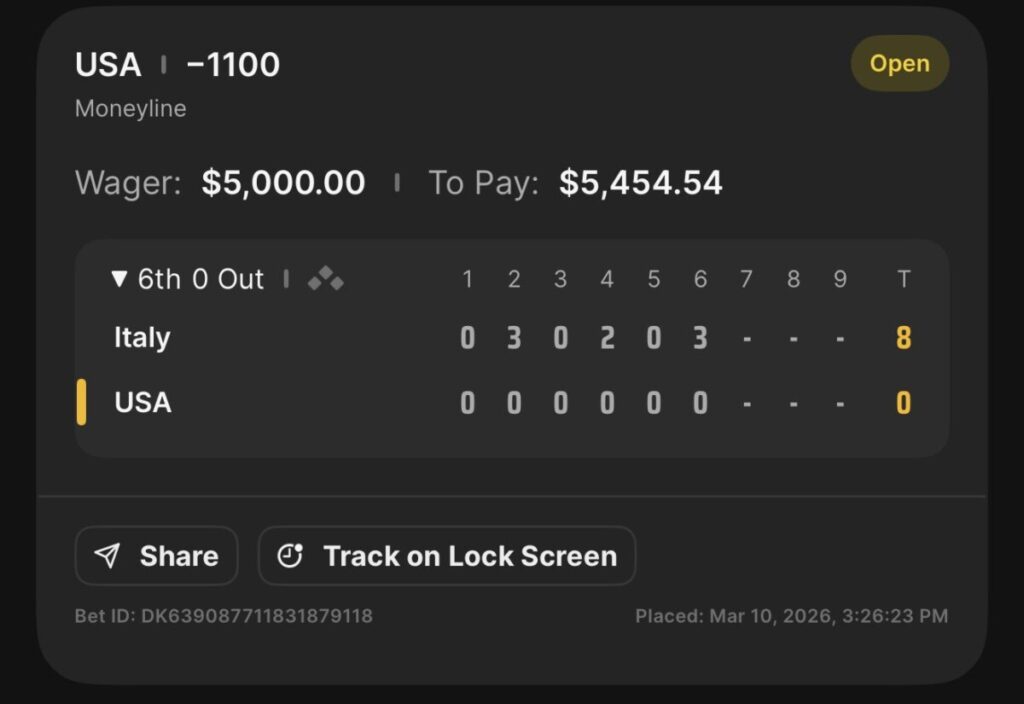 He ended up betting on the US to beat Italy in the World Baseball Classic at odds of -1100. If successful, he would have won $454.54.