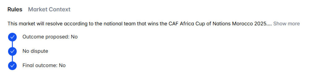 Polymarket appears to be going down the same route as Kalshi, with no change to its market resolution. The site shows there was no dispute on the result, and it has settled wagers on Morocco to win the tournament as “no.”