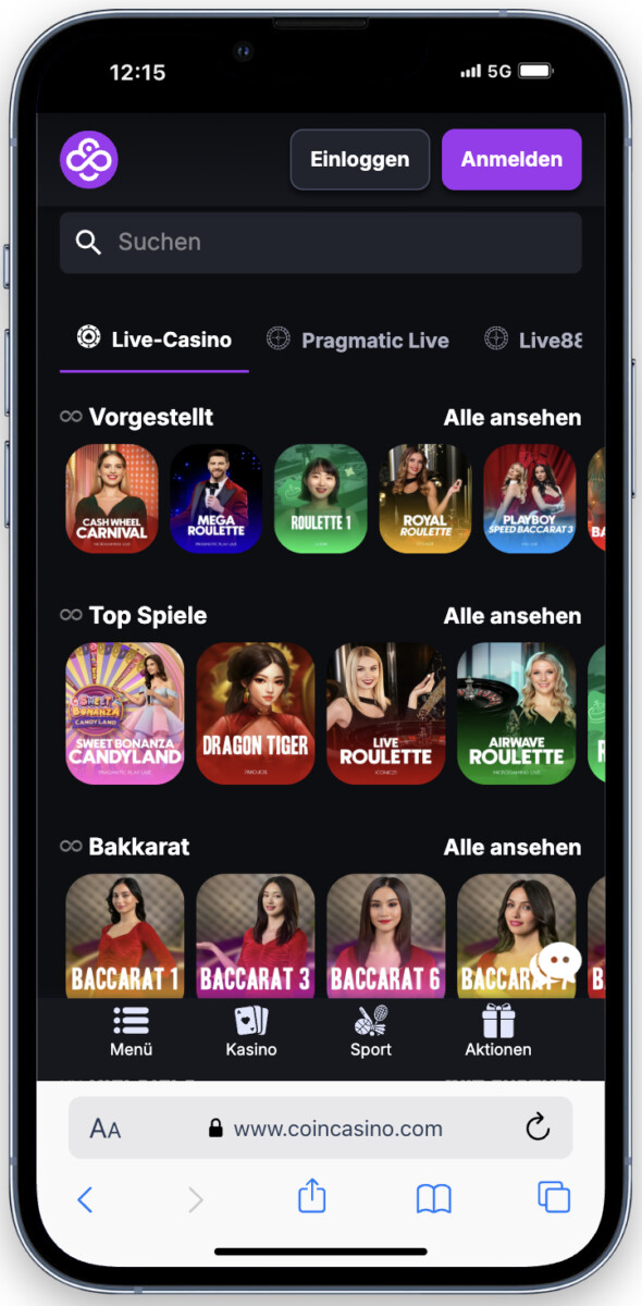 Das absolute Highlight ist aber das Live-Casino, das in unserem Test herausstach: Hier warten nicht nur Klassiker wie Baccarat, Poker und Dragon Tiger, sondern auch beliebte Game Shows wie Sweet Bonanza Candyland, Mega Roulette, Cash Wheel Carnival oder Vegas Ball Bonanza. Besonders gelungen: Die hohe Streaming-Qualität, charmante Hosts und viele Tische mit hohen Limits für anspruchsvolle Spieler. CoinCasino kombiniert Krypto-Komfort mit einem erstklassigen Live-Spielerlebnis, wie man es sonst nur selten findet.
