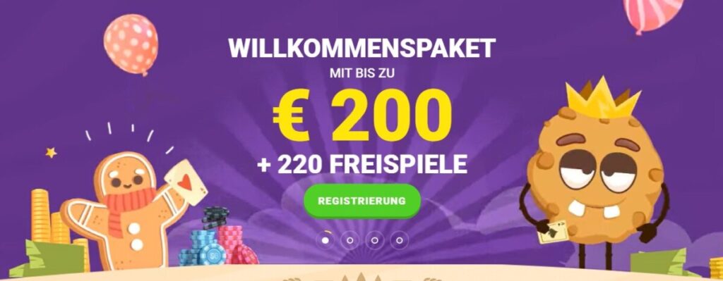 Der Cookie heißt Sie mit einem zweiteiligen Willkommensbonus im Wert von bis zu 200 Euro sowie 220 Freispielen in seinem Casino willkommen. Damit es Ihnen dabei nicht langweilig wird, hat er Ihnen zudem eine Spielauswahl mit mehr als 2 000 Casinospielen zusammengestellt und darunter befinden sich selbstverständlich auch zahlreiche Live Dealer Spiele. All dies wird von nach eigenen Angaben „ultraschnellen Casino Auszahlungen“ garniert!