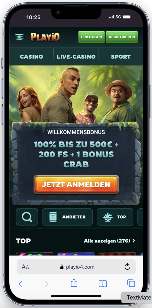 PlayiO hat uns als Casino ohne deutsche Lizenz im Test voll überzeugt – mit starken RTP-Werten, modernen Games und einem Willkommensbonus, der sich sehen lassen kann: 100 % bis zu 500 € + 200 Freispiele + 1 Bonus Crab!