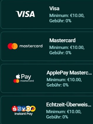 | Zahlungsanbieter | Kreditkarte, Krypto, Prepaidkarten, eWallets, Sofortüberweisung |