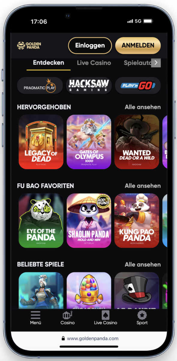 Golden Panda ist eine Top-Adresse für alle, die ein Casino ohne Verifizierung mit starkem Spielangebot suchen. Eine Anmeldung ist ohne KYC möglich, so dass Sie sofort loslegen können. Positiv überrascht haben uns die exklusiven Golden Panda Originals wie Plinko, Dice und Hi-Lo sowie ein starkes Live-Casino mit Sweet Bonanza Candyland, Roulette und Blackjack.