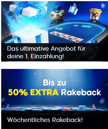 | Reload-Bonus | 10 % Rakeback auf den wöchentlich gespielten Betrag. | 25 % Reload-Bonus auf eine Einzahlung von 50 € oder mehr. |