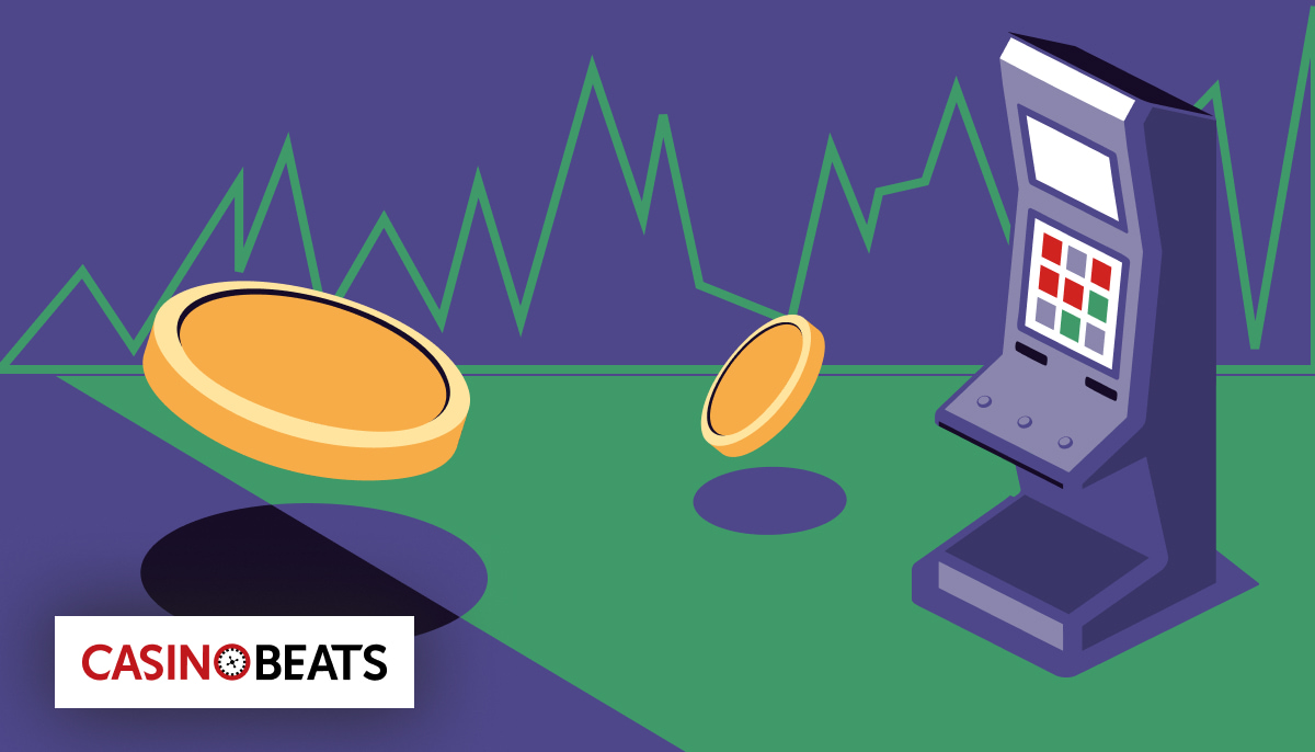 Illustration of two coins spinning near a digital slot machine on a green surface