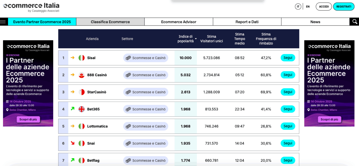 Nel ranking stilato da Casaleggio Associati per l’e‑commerce italiano, che analizza migliaia di siti in base a indicatori come visitatori unici, tempo medio di permanenza, frequenza di rimbalzo e rilevanza online, arriva un forte segnale dalla performance di agosto: Sisal sale con decisione al nono posto nella graduatoria generale dei siti e‑commerce più popolari, segnando un avanzamento significativo rispetto al mese precedente.