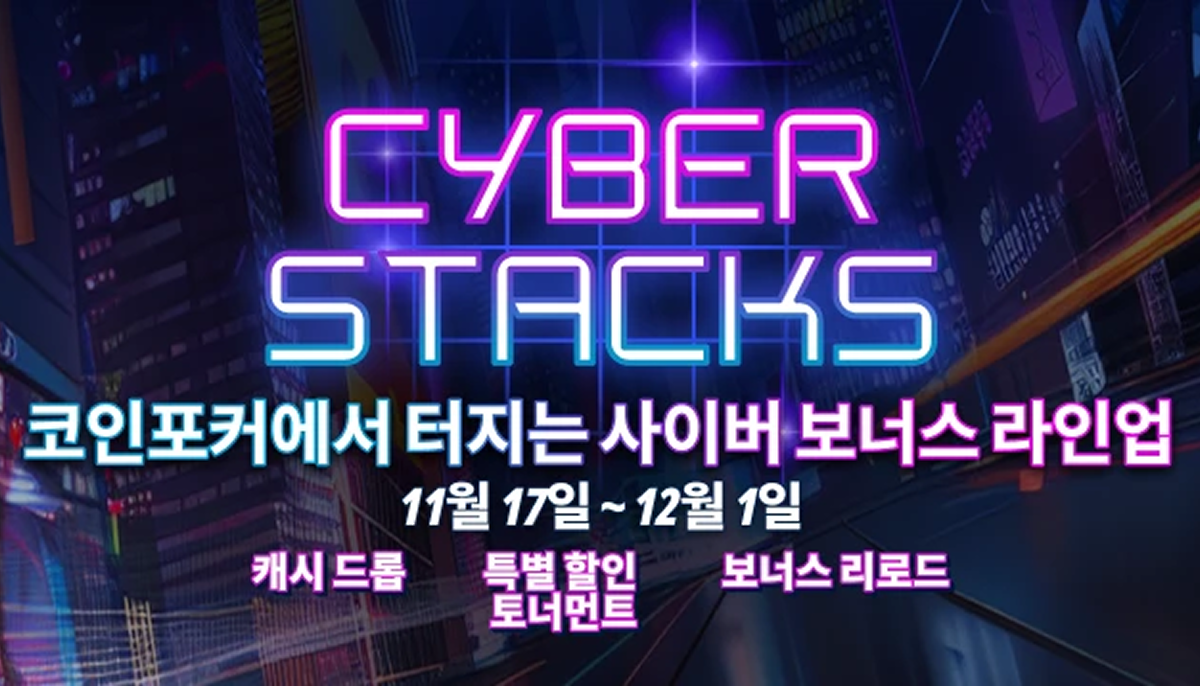 블랙 프라이데이와 사이버 먼데이를 겨냥한 코인포커의 최대 규모 프로모션이 시작된다. 사이버 스택스는 11월 17일 시작해 12월 1일까지 이어지며, 총 $30,000 규모의 캐시 드롭을 비롯해 코인마스터즈 토너먼트 특가와 입금자 전원 대상 리로드 보너스가 준비됐다.