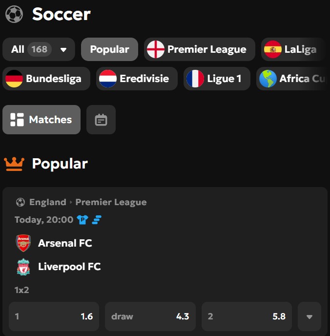 Ga naar het sportoverzicht en selecteer de sport waarop je wilt wedden.