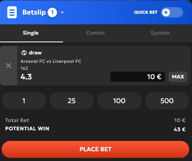 Klik op de gewenste wedstrijd en kies de weddenschap die je wilt plaatsen. Deze wordt automatisch toegevoegd aan je betslip.