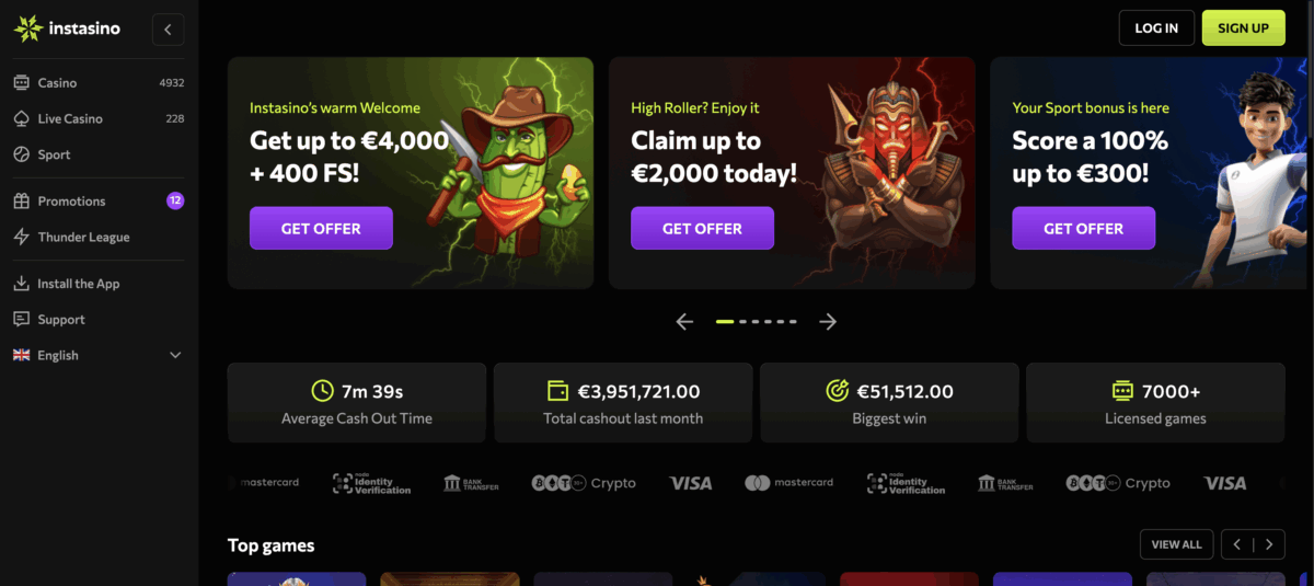 Instasino mikt op snelheid en beleving. Nieuwe spelers starten met een 120% bonus tot € 750 + 125 free spins, met een inzetvereiste van x40 en 20 dagen geldigheid. Via de Thunder League vip club stijg je in levels voor tot wel 10% cashback en hogere uitbetalingslimieten.