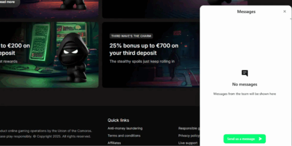 Betninja biedt momenteel geen no deposit bonus aan. Om te spelen of een bonus te claimen, is altijd een minimale storting van € 20 vereist. Gratis speelgeld zonder storting is zeldzaam bij dit soort crypto-vriendelijke casino’s.