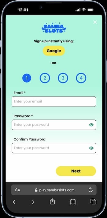 Korte uitleg: hieronder zie je in één oogopslag hoe je je aanmeldt bij Samba Slots en de 200% welkomstbonus activeert. De cashback van 10% elke maandag loopt automatisch mee.