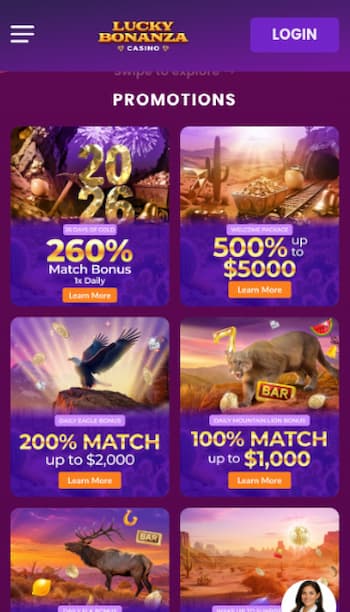 Lucky Bonanza is a bonus-led casino that suits you if you’re comfortable with higher wagering requirements in exchange for a larger starting balance. As a new joiner, you can claim a 500% welcome bonus up to $5,000 with a $25 minimum deposit, although the bonus comes with a 60x wagering requirement.