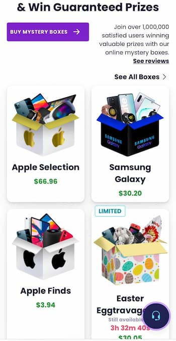 If you like surprises, you’ll love mystery boxes. You may encounter themed boxes, such as “Tech Surprise Box,” with visible prize previews before you open them.