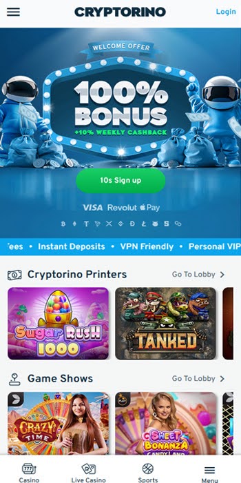 What sets Cryptorino apart is its flexibility: while it ranks among the best Bitcoin casinos on Telegram, it also accepts fiat options like Visa, MasterCard, ApplePay, GooglePay, and Revolut, which can be used to purchase crypto directly in‑app. Combined with Telegram‑exclusive bonuses and a responsive bot interface, this makes Cryptorino one of the easiest entry points for real money gambling on Telegram.
