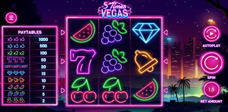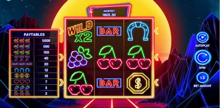 - What’s the vibe: A retro fruit slot machine with three reels, neon, with catchy ’80s music and fun bonus action.