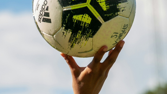 En hand håller upp en Adidas-fotboll mot himlen, klar och solig dag.