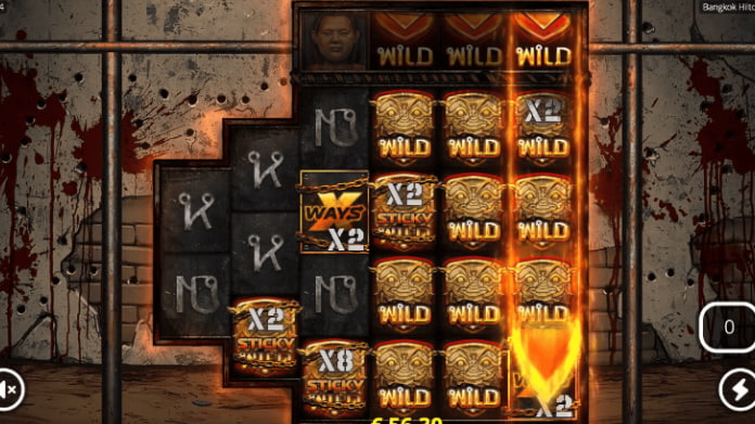Slotspel med blodig fängelsetema och symboler som WILD, multiplikatorer och Sticky Wilds.