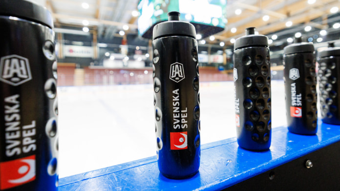 Vattenflaskor med Svenska Spel-logotypen uppställda vid sargen på en ishockeyrink.
