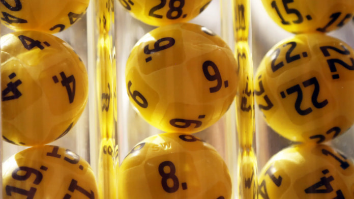 Närbild på gula lotteribollar med svarta siffror i en dragmaskin