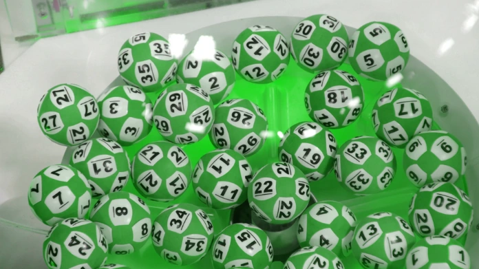 Gröna keno-bollar med svarta siffror samlade i genomskinlig behållare inför dragning.