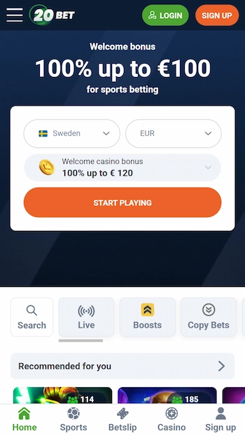 20Bet är en bettingsida utan licens i Sverige med användarvänlig design, generöst VIP-program för sport betting, Cashout, boostade odds och snabba uttag på vinster.